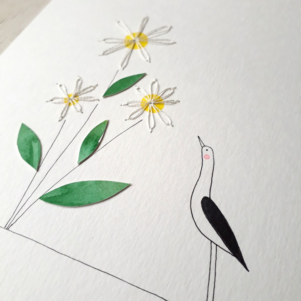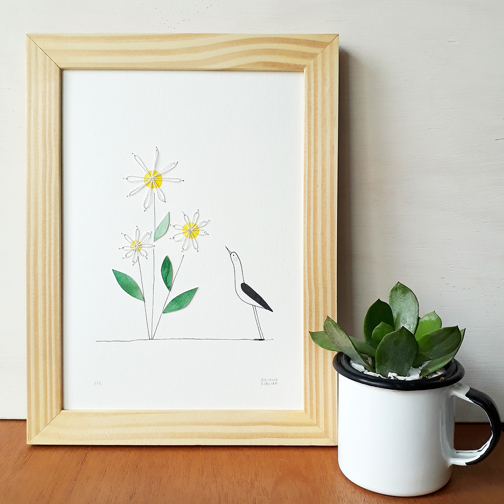 As aves são criaturas cuja curiosidade, ingenuidade, liberdade e presença sempre me fascinam! Por isso as escolhi para esta série de ilustrações desenvolvidas com desenho, aquarela, colagem e bordado sobre papel 300g, 15 x 21 cm. Cada uma traz um aspecto poético sobre a contemplação da vida e da natureza, retratado de forma muito delicada.