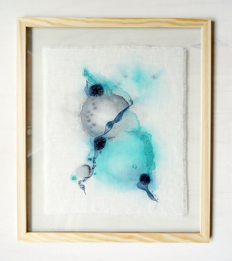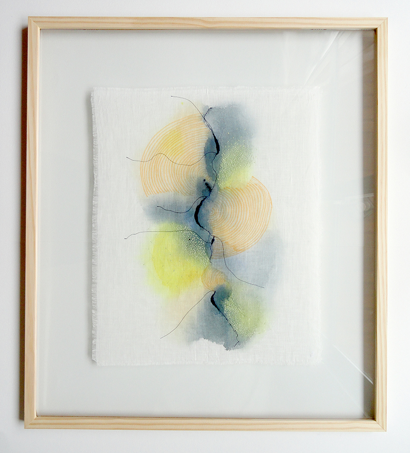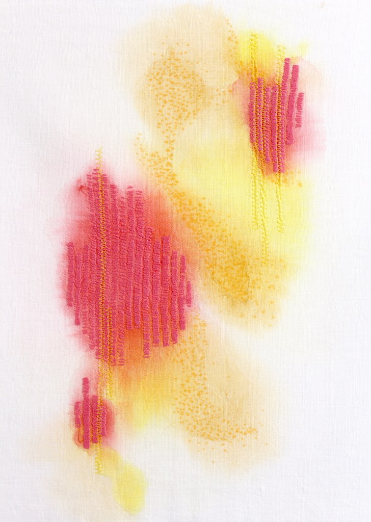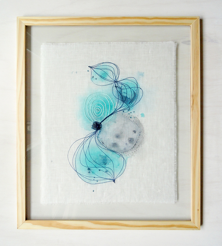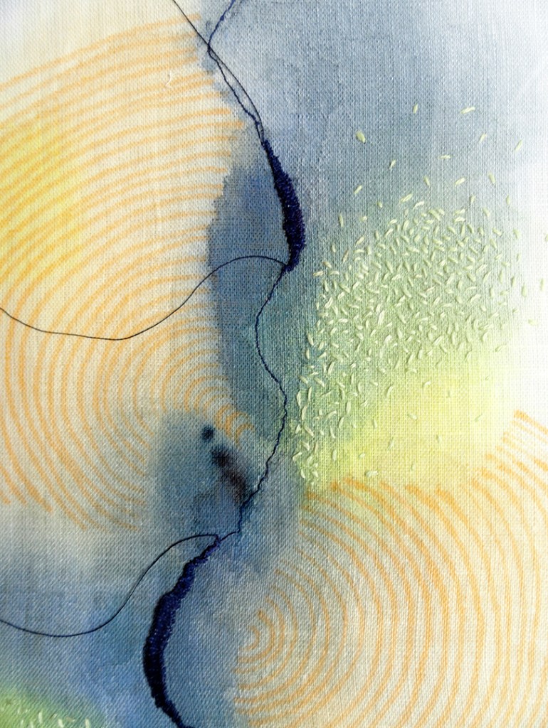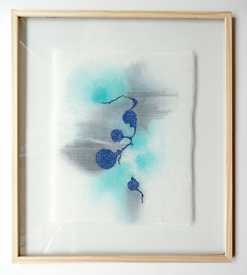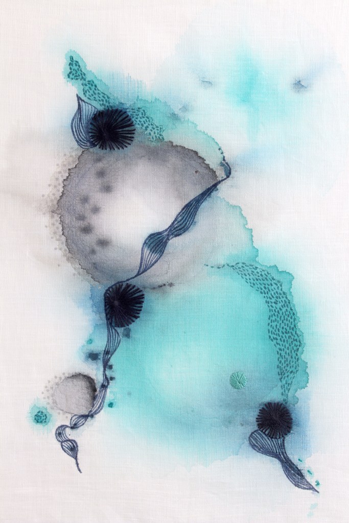 Manchas em aquarela na superfície têxtil traduzem as águas, os sentimentos internos intuitivamente liberados e alinhavados por minuciosas costuras e bordados a evocar a meditação, o aconchego e a cura interior.